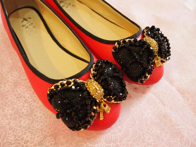 橘紅色搭上黑色蝴蝶結與金色水鑽。